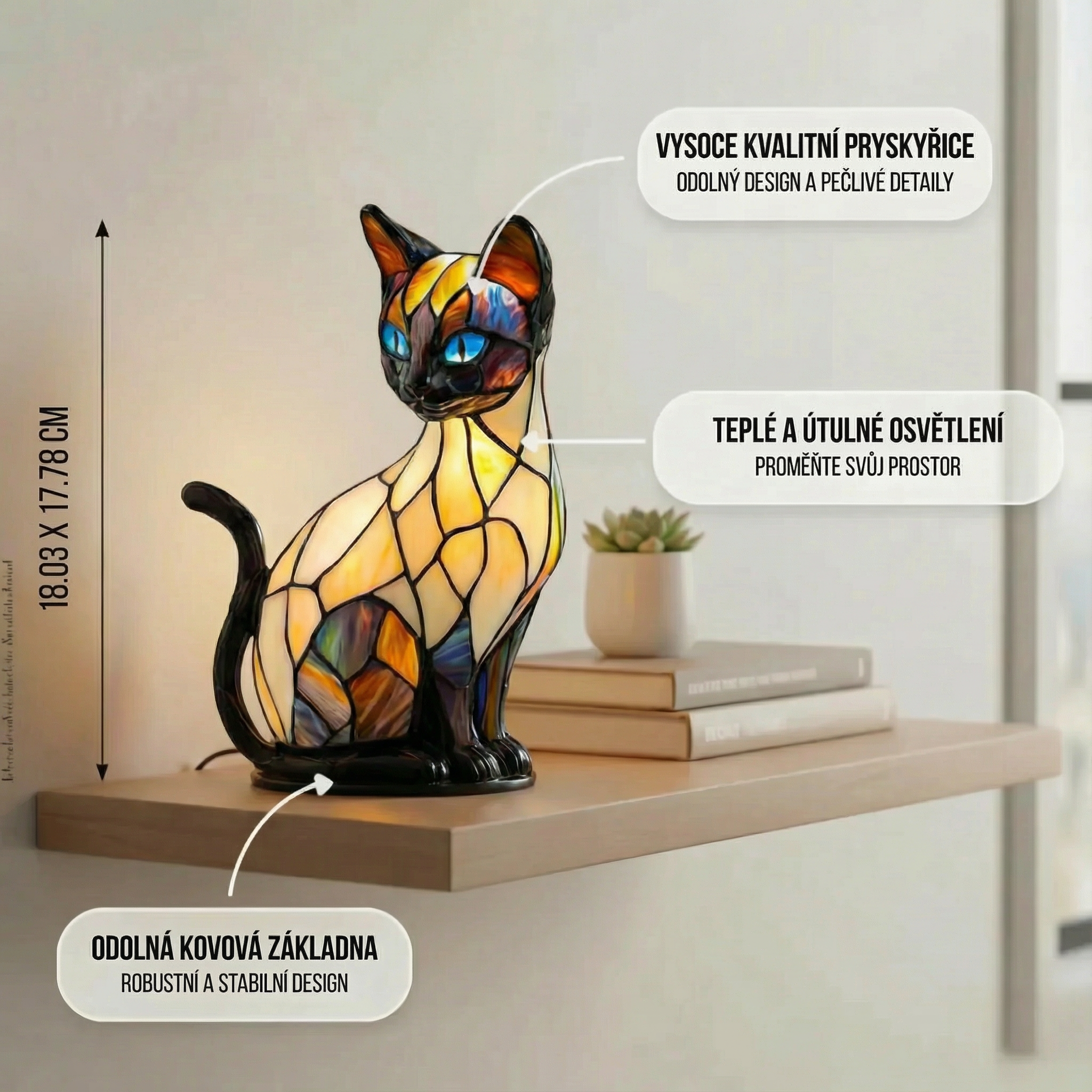 Lampa Mystický kočka je dokonalým doplňkem pro každého, kdo chce oživit svůj prostor. Její design s živými barvami z vitráží vytváří veselou, odvážnou a jedinečnou atmosféru. Lampa vydává jemné a uklidňující světlo, které promění každý kout v elegantní a útulné místo. Její kompaktní rozměry ji dělají ideální pro noční stolky, komody nebo jakýkoli prostor, který potřebuje rozjasnit.