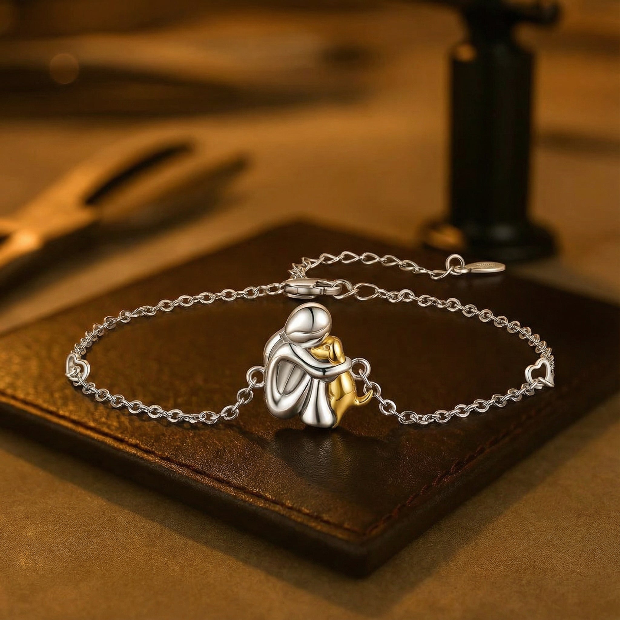 Ez a finom karkötő gyengéd emlékeztető a szerelemre, amely soha nem hagy el. Egy nőt és kutyáját ábrázoló apró minta megragadja a melegséget, a hűséget és a néma kapcsolatot. Könnyű és kényelmes, csuklón vagy bokán is viselhető – lágy jelentőséggel töltve meg minden napot.